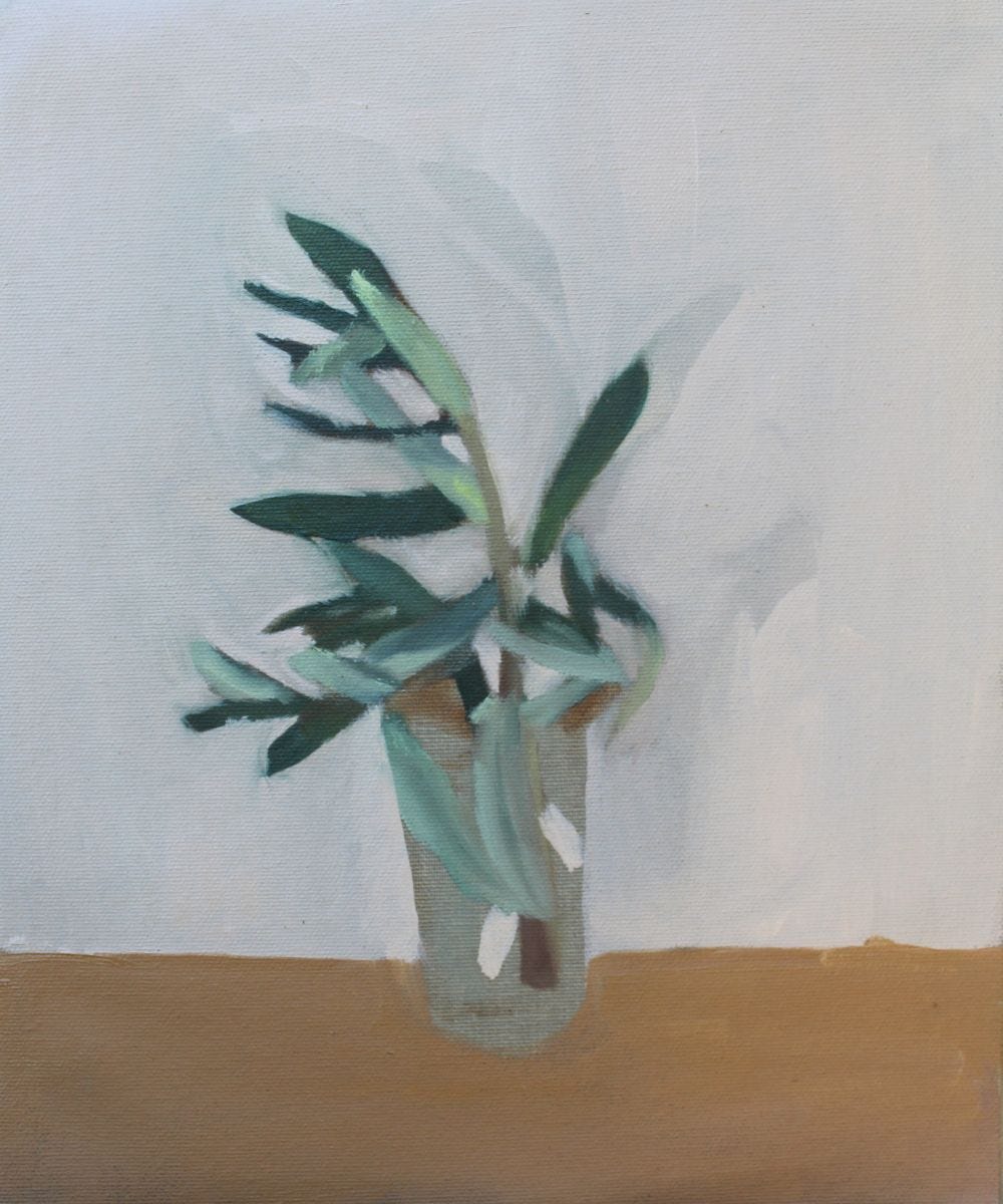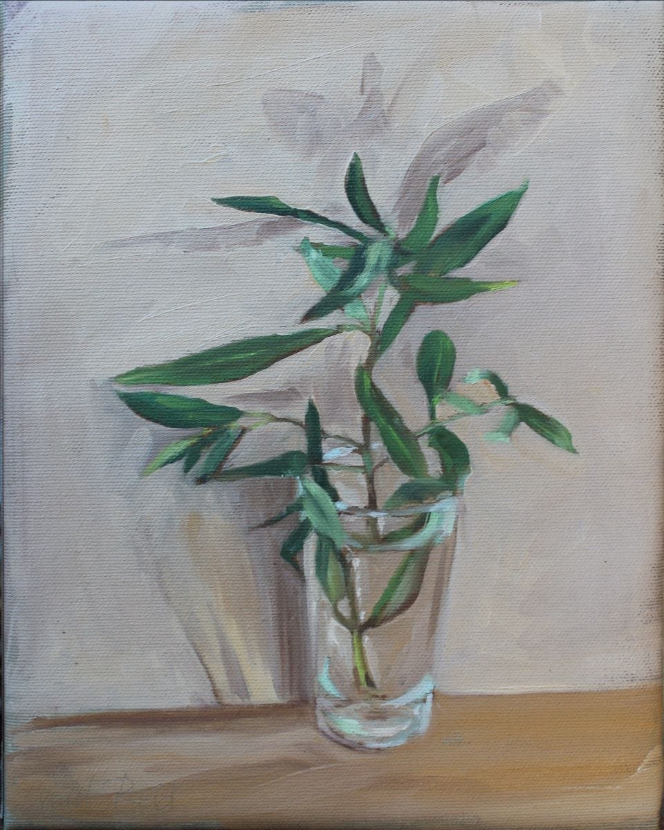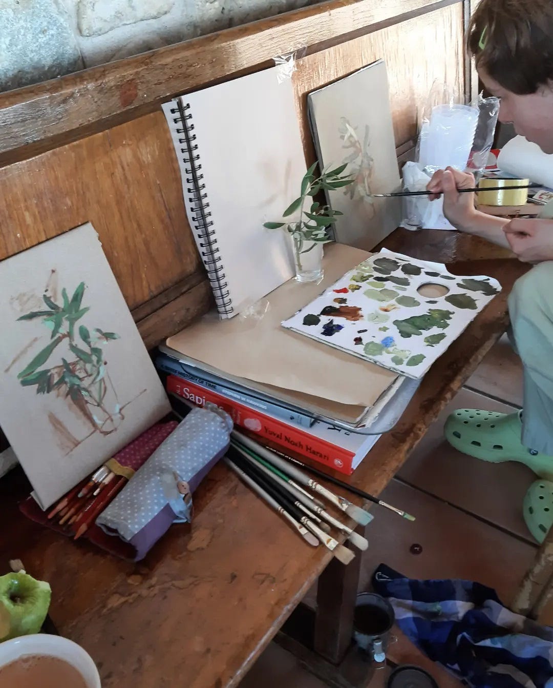 Although the olives trees weren't fruiting, I was happy to set up a little jar with a leafy sprig to paint 'sight size' as an exercise. It takes a lot of faffing to get canvas, subject, and eye properly aligned, but I was inspired by the wonderful process videos and results of Felicity Starr. Ted (more of him later) and I managed to each paint the same still life, sharing paints and talking through issues as we learned together. It is always fascinating to see how differently two people can interpret a subject. Also cathartic to witness another artist wrestling and dissatisfied - I hope very much that Future Ted will look back at what he painted and appreciate the beautiful shapes and sophisticated design.Â