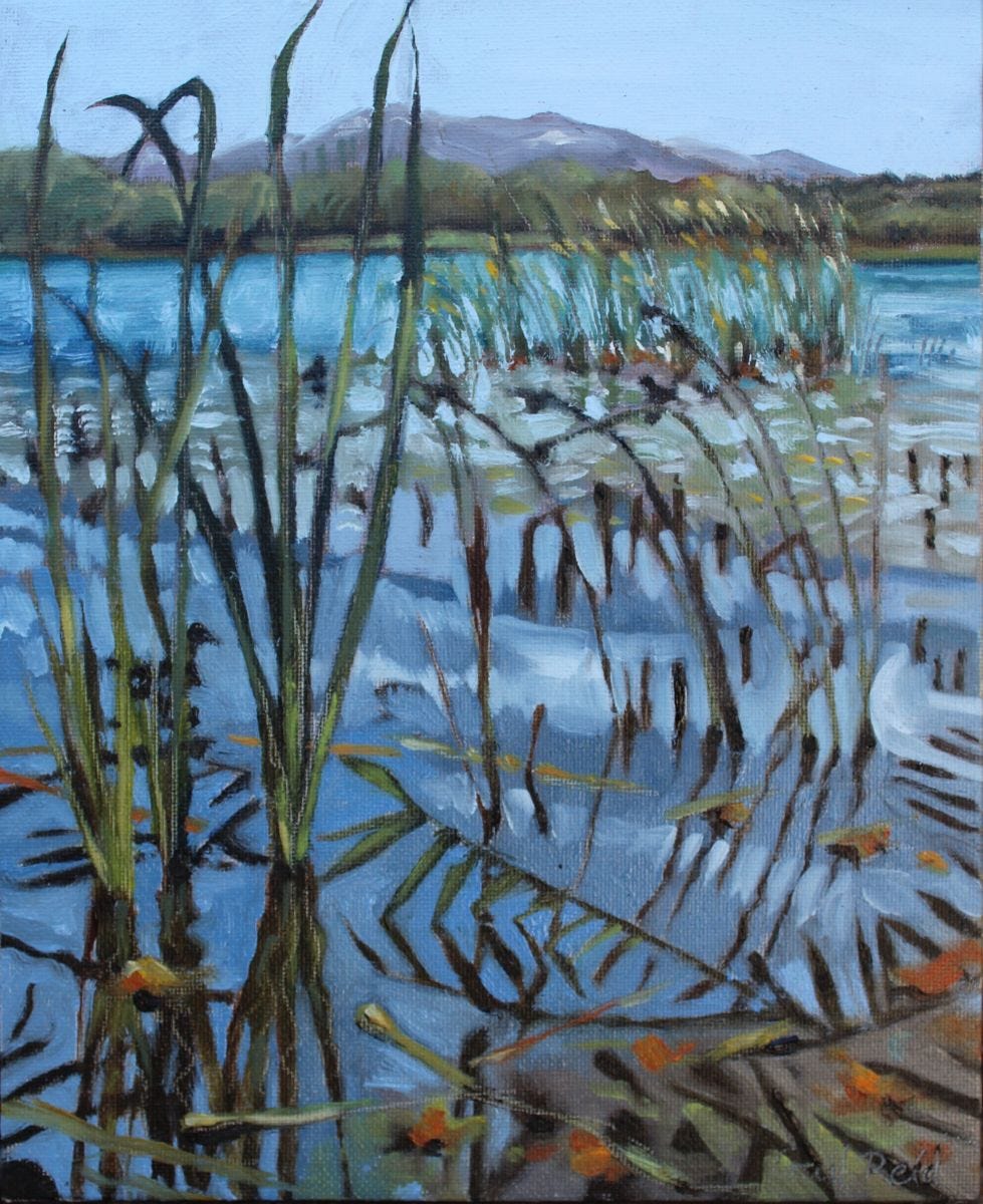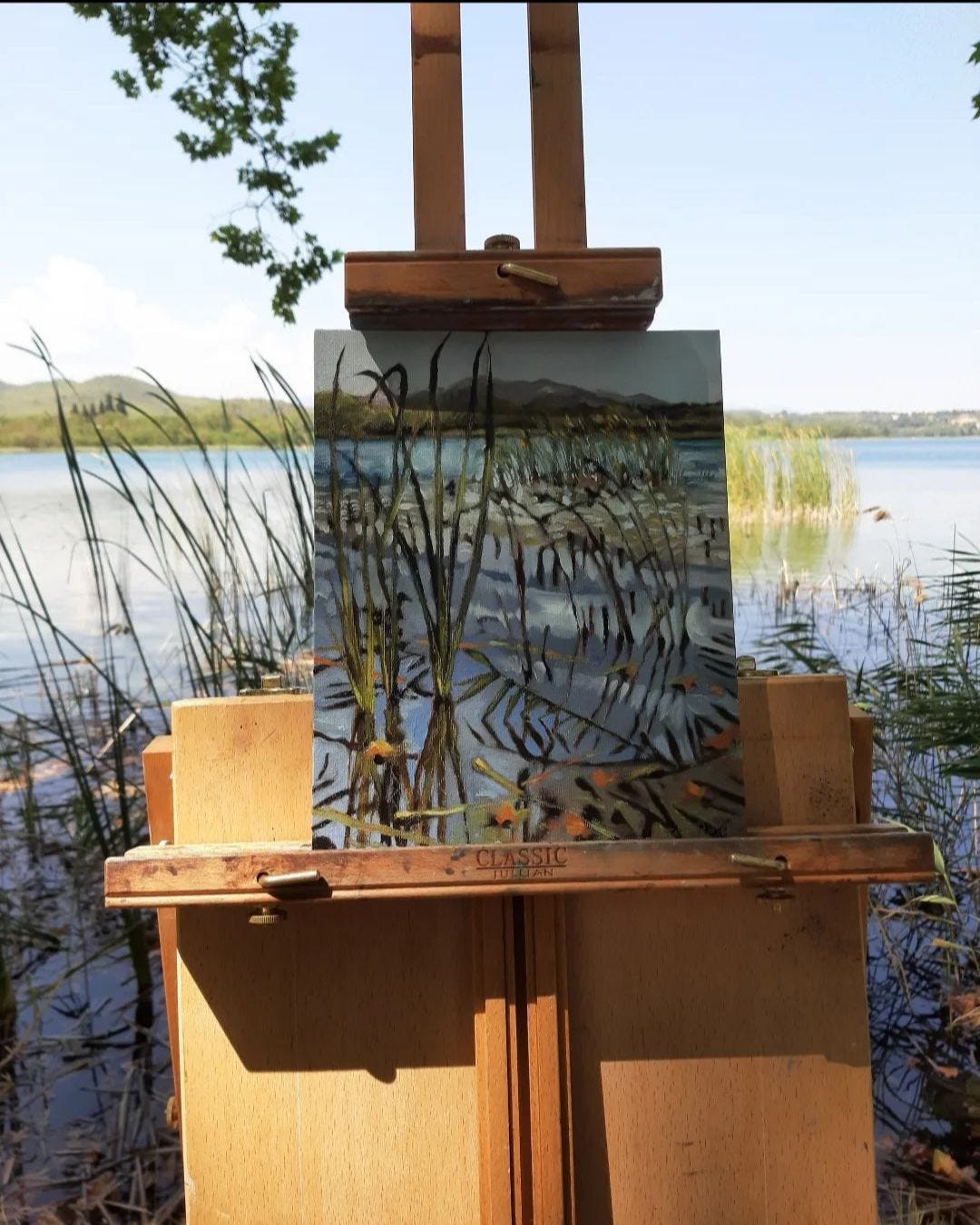 To stave off sloth, we did a couple of runs around the nearby lake, which involved setting off at 8am to miss the heat. The second time I planned ahead and brought my easel. Despite the picturesque boathouses, I was drawn to this view of coots milling round reflected reeds, the Pyrenees in the background. It felt like I painted for a couple of hours, but the clock said it was four.Â