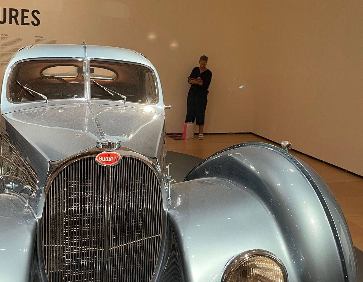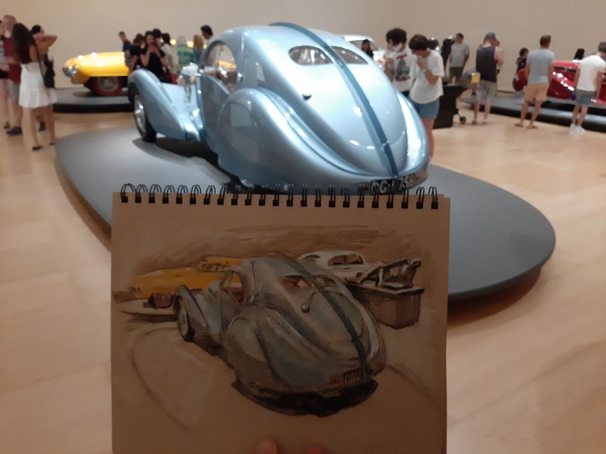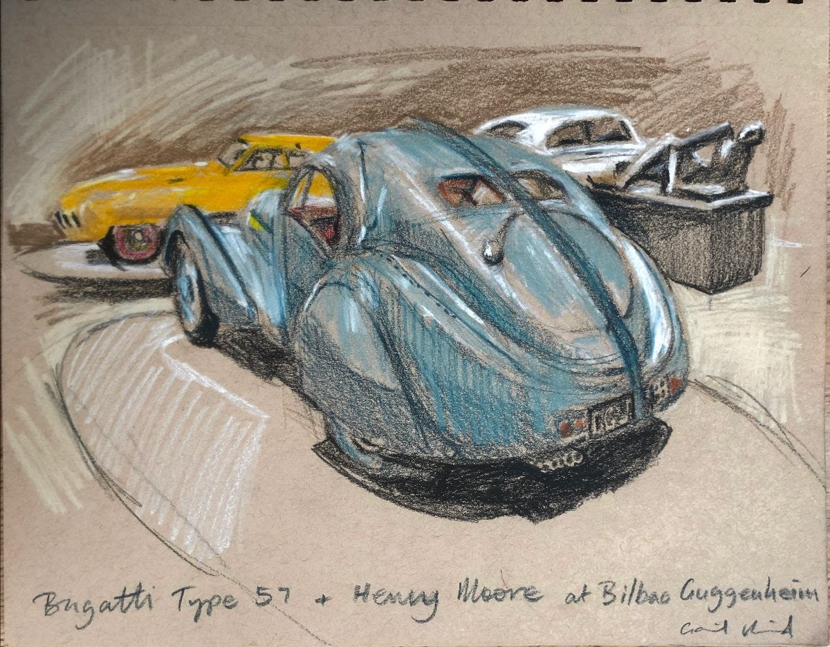 The Guggenheim have a fantastic exhibition "Motion" curated by Norman Foster, centred around a display of iconic cars including the first ever car, Firebirds, a Cadillac, and a bisected Mini. Tying together art, design, and construction, my favourite room had a Bugatti alongside the Henry Moore sculpture "Reclining Figure". Ignoring the somewhat hushed reverence of the room, I broke out my pencil roll and stood sketching in a corner - marvelling at the curves and angles in both the car and the sculpture.