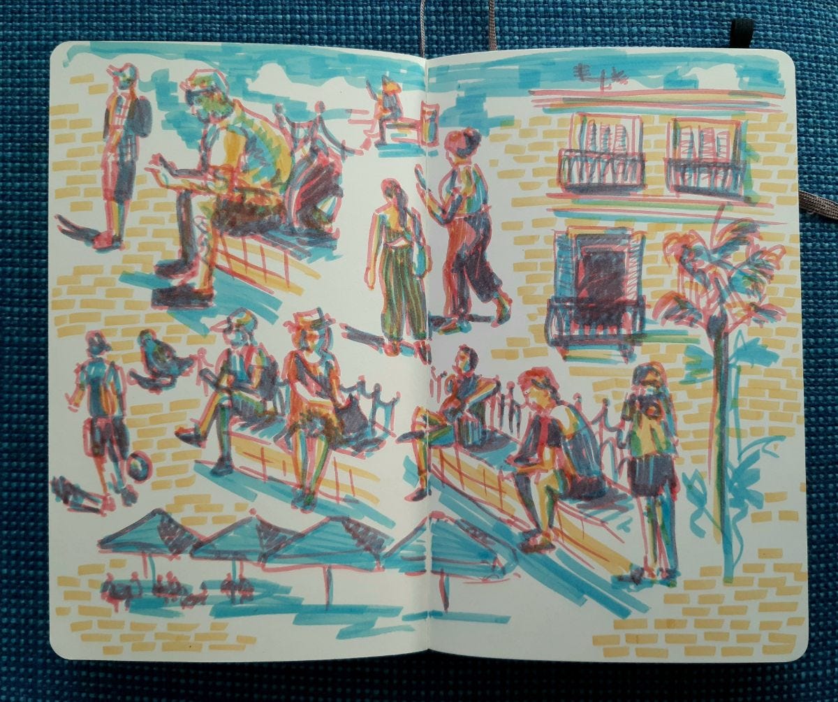On our last day, Izzi and I headed to a nearby square to practice sketching people. We spent a lovely hour picking off locals and tourists. Again, I loved the difference in our approaches, and comparing who we'd each been drawn to draw.