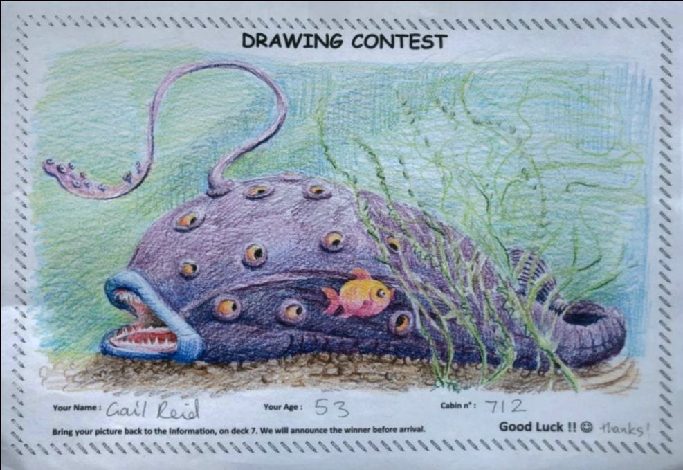 At last, artistic distraction arrived in a most unexpected form: Brittany Ferries run lots of entertainment on their ferries. I managed to resist Bingo, Shuffleboard, the music quiz, and lots more. But the drawing competition was too much for my inner child. The theme was sea creatures. No age limit, they said... When it comes to elbowing children aside, shameless is my middle name!