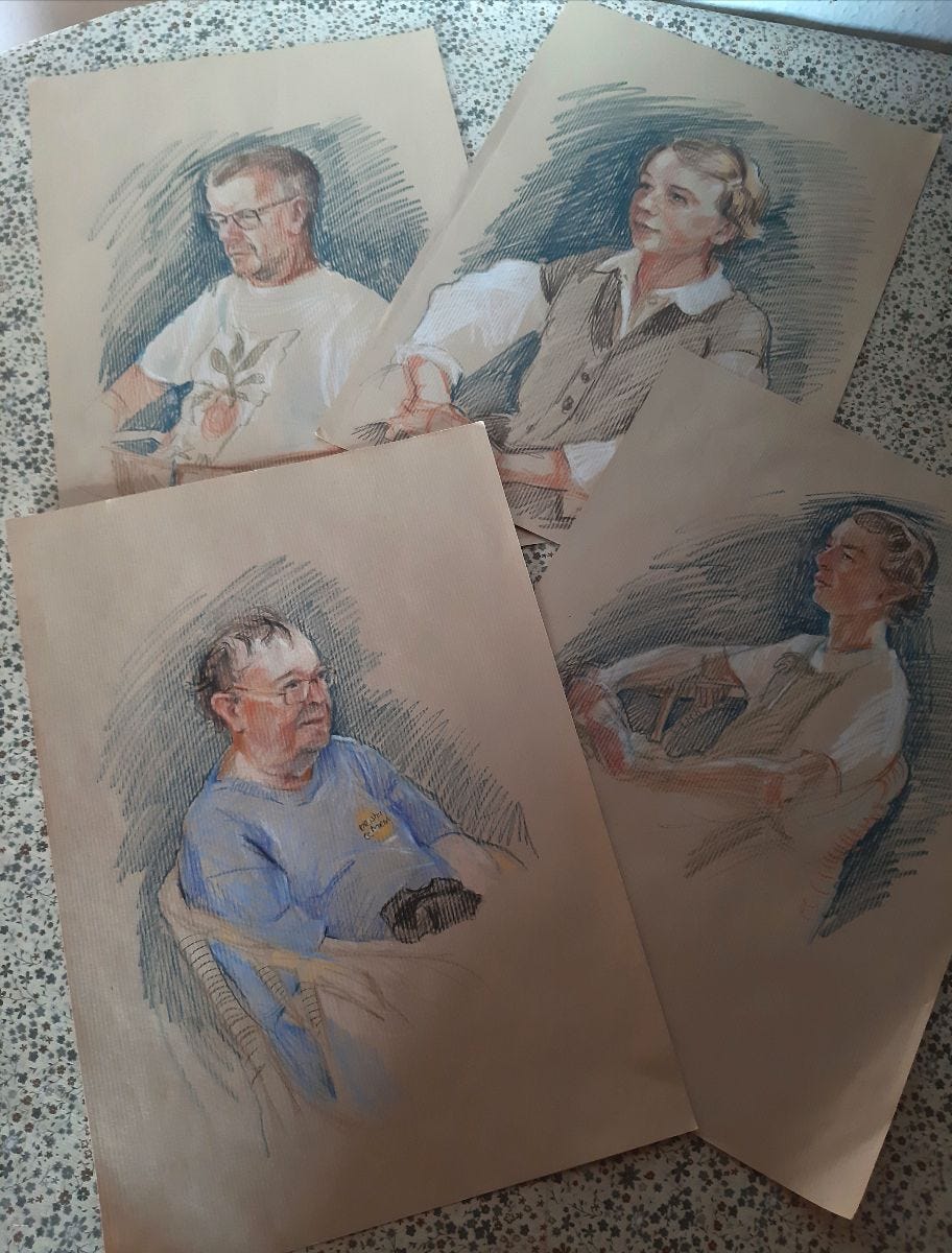 I love sketching people more than anything - whether they're posing or oblivious. There's something about being drawn that, in the context of a lazy holiday, feels slightly like work, so I was grateful to friends for agreeing to sit even stiller than they already were! I've drawn the same friends on the same annual holiday for decades now, so they know the deal. They are kind enough to make me feel a million dollars by indulging me with their attendance at an end-of-holiday Private View, reliving moments and places together. Some people order prints, compare notes on their portraits, and I do a giveaway draw for the originals.