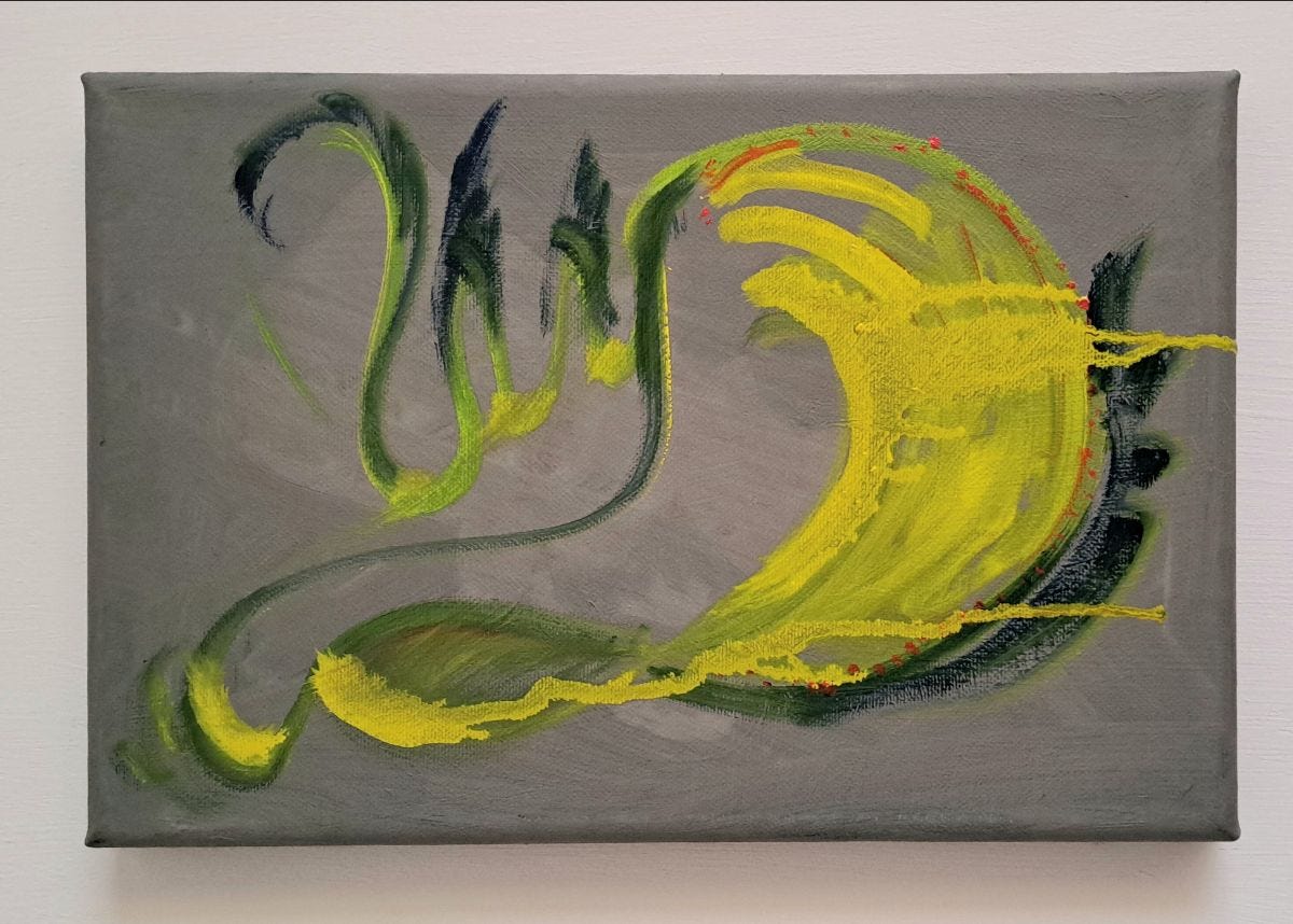 After spending decades trying to paint and draw what's in front of me, I offer you an exclusive glimpse of my new line of artistic enquiry. Responding to the legalisation of cannabis in Germany, my foray into abstraction captures the spirit of abandon and contemplation in Poll, a traditional village in the warm Baden-Württemberg region. I'd love to know how you really feel about this first piece in the series: