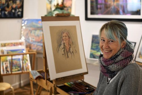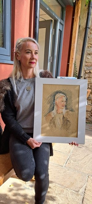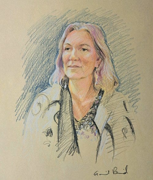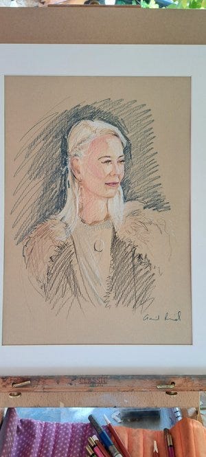 When people sit, I usually ask if there’s anything they particularly want captured/downplayed. Michelle is a warm and natural connector with people. She asked me to capture that softness - and we enjoyed a lovely conversation while she was drawn - the time flew. Those are Sarah Trenchard’s wonderful colourful paintings behind her.