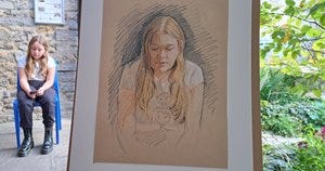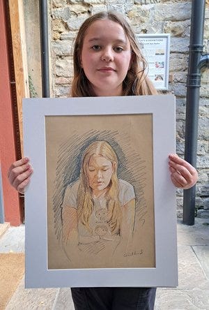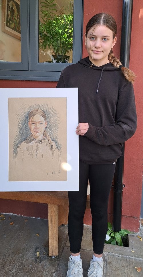 So here’s a lovely story - Beth brought glamour to proceedings (she once won a Daenerys lookalike competition!) with brilliant lipstick and fantastic fake fur epaulettes. I know from experience that some people just don’t like their portraits, and sometimes it takes a while to get past the surreal experience of seeing yourself through someone else’s eyes. I try not to put people under pressure to give a ‘verdict’ for my sake, reassuring them if there’s anything they’d like adjusted that I’m not sensitive about changes. So Beth’s portrait was one of those where I wasn’t 100% sure she was convinced… and I mulled over it for the rest of the day. Anyway, you have to let these things go, so I did. But then, imagine my delight when Beth appeared the following day, having booked another sitting - because her mum wanted the portrait, but Beth didn’t want to hand it over! It was nice to be able to draw Beth inside on Sunday, giving quite a different lighting effect.