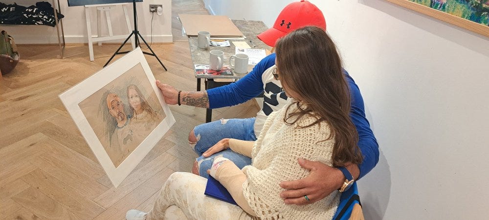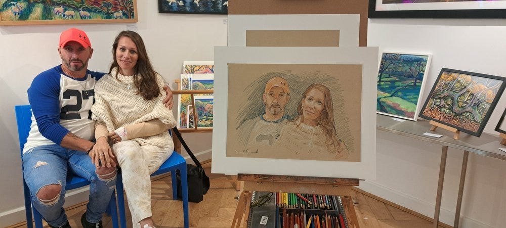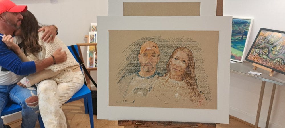 Rodrigo and Jana saw my portrait of Sarah, and asked for a double one. I just had one slot left at the end of the day, and knew I’d be tired, but couldn’t resist pushing the boat out. There are several extra considerations in a double portrait: The risk (of messing up) is double, because if one goes wrong I’d have to restart both. It is compositionally challenging to get the perspective of the heads relative to each other. It’s a tall order to sit still for an hour, so I dotted between the two images, meaning the person not being drawn could relax. They were brimming with young love, he was adamant the hat (a gift from her) was to stay - I thought his hand round her was a lovely detail to include too. As a knitter, her top was a gift!