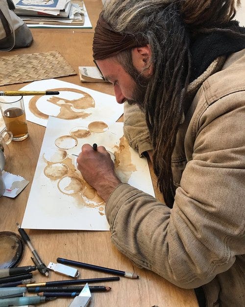Wil is a core artist at Heart Of The Tribe gallery, and was working/demonstrating alongside me in the garden, using his trademark painting medium: espresso! Wil plans to give his portrait to his mum. I found myself hoping that one day my children would do the same for me. It was lovely to spend time with Wil, we listened to a recording of music that he’d played in the gallery garden recently, and talked about whatever it is that artists talk about. Will was a great subject, and asked for his headscarf to be red. See Wil’s work on his gallery profile here