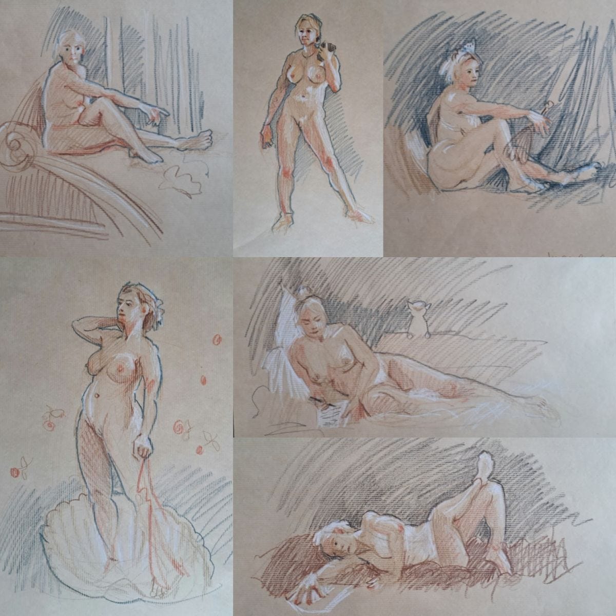 Clare then talked about how, as a life model, she routinely tries to combat being cast in this way, by 'activating' passive poses. She demonstrated what she meant, recreating a series of classic examples of the male gaze in art, plus (the other side of the same coin) reconstructing two archetypal male tropes. Can you identify any/all of these well known works of art? My favourite was how she reclaimed Titian's 'Venus of Urbina' by (instead of languishing seductively), posing "as if writing my talk about the male gaze". It inspired the 'reading' pose I asked Izzi to take for the reference photo above. Answers at the end of this newsletter.