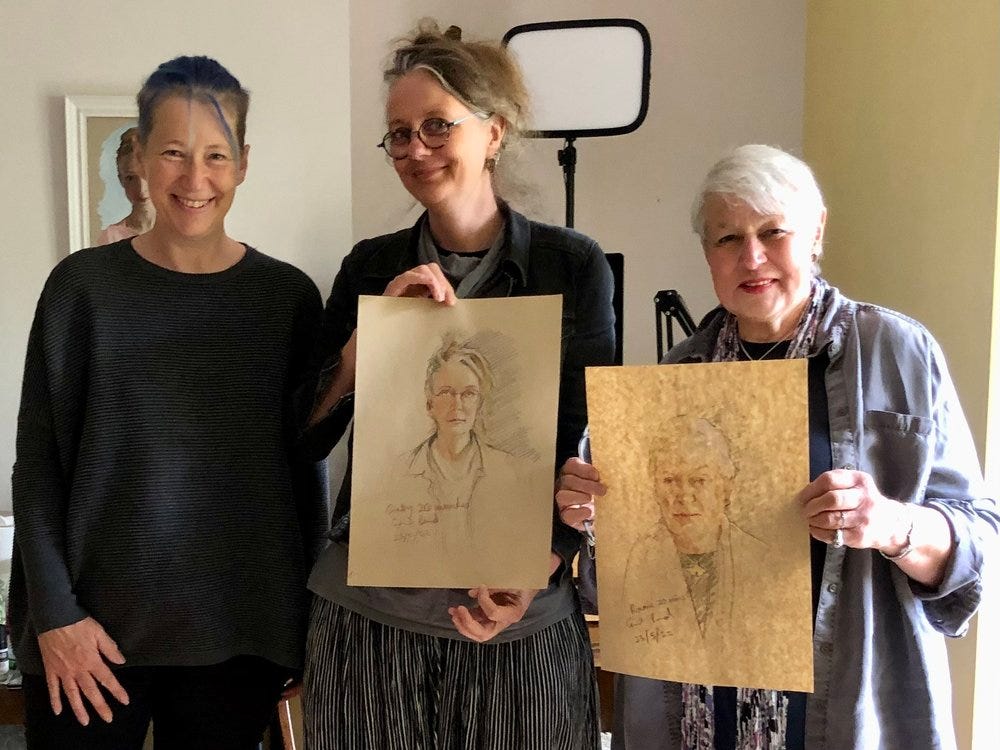 I learned that some people find it really hard to be still (thanks Alan!), and some want to be drawn smiling (thanks Angela ❤). I learned about the challenge of seeing face shape through facial hair and under a hat (thanks Gertie!). Gai wanted to include a flower she’d picked on the way over. Kim found the visual chaos of my studio disturbing, and elected to close her eyes. Trish sat with hair up and hair down, and I realised the need to project a warm personality, even with a resting face. Every person I drew taught me something about how to brief a sitter, how to help them enjoy the experience, how to deal with timers, broken pencils, interruptions, etc… but still the likeness was very inconsistent.