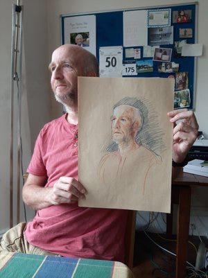 I thought I’d do a few practice runs, and that would suffice. Pre-Covid, I had done regular ‘short pose’ drawing from professional models. Although the understanding of light and proportion definitely helps, drawing from models comes with no pressure to get a likeness, or indeed to produce anything ‘for’ anyone. Also, professionals are very good at being still!