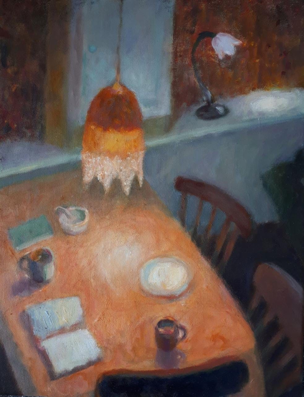 “My Childhood - The Chenille Tablecloth” was based purely on memory. So how could I be definite about the edges? I really felt that it was more about the mood. I didn’t want the paint to interfere too much. I wanted it to be so that you just felt the enclosure of the room, and the lamp light was sort of glowing and pervasive. And maybe the painting carried on beyond, with no edges.