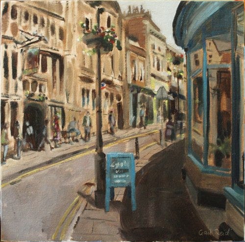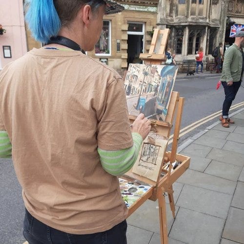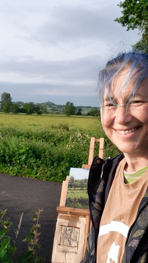 One spring morning, I went to paint in Glastonbury, about an hour’s drive from my hometown Bristol. I parked for the day, hoiked my clobber out of the car boot, and set off down the High Street to scope for locations. This unique town was ”Normal for Glastonbury”, so no shortage of crystal shops, wizards, singing, chanting, meditating, and drumming.