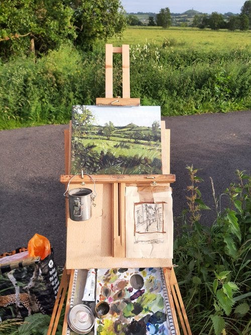 Looking in my rear view mirror, I caught a beautiful glimpse of the Tor nestling on green land, in the late afternoon sun. One rather eccentric manoeuvre later, I pulled into a side road and parked by a gate. I trampled down enough verge nettles to put up my easel without blocking the lane, and set to it.