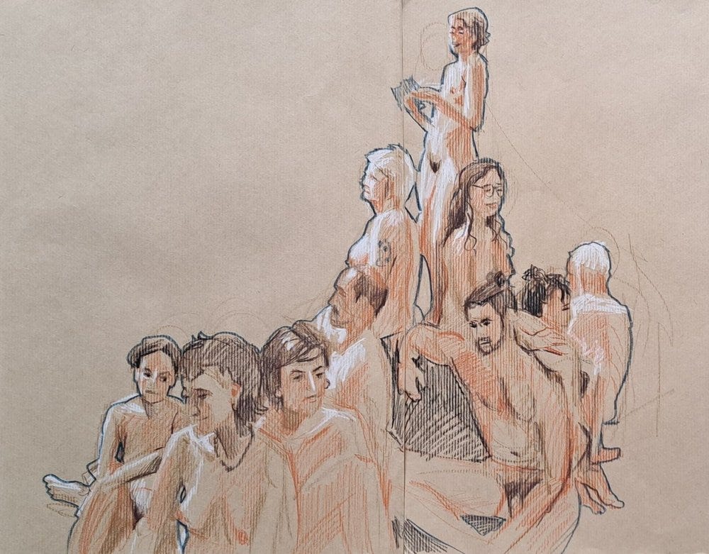 Just to assert the glorious nature of humanity, here's my 40-minute sketch from life drawing last week - no less than 12 of the regular models in the Bristol 'United Models' collective posed together (two were out of my eyeline). To pass the time, they first counted themselves. Not in a logical way, but with affection, and for the comedy value of counting without a plan: they randomly called out consecutive numbers, restarting at “1” when two people called out simultaneously. When they finally reached 12, Fra Beecher (on the drawing above, and here at the top of the pile with pamphlet in hand) read 12 of her poems.