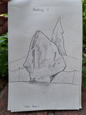 The following day was jam packed, even by my standards! Avebury is a prehistoric world heritage site, near Stonehenge, on the way back from Oxford to Bristol We had lunch there, then the boys amplified their gastric churning by rolling down the steep grassy banks. Next we walked round the Neolithic stone circle, constructed nearly 5000 years ago, in search of the best spot to sit and draw.