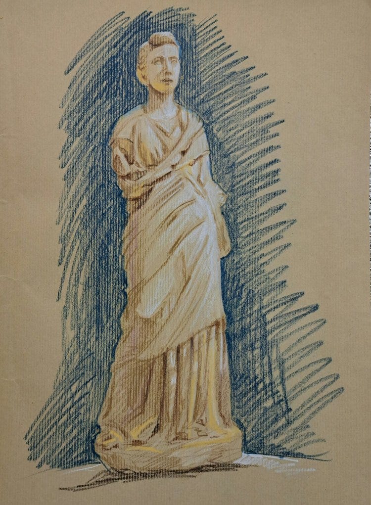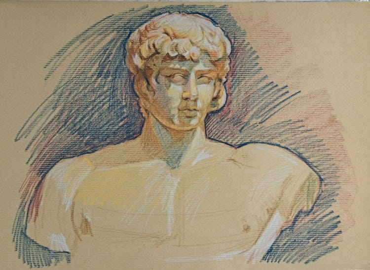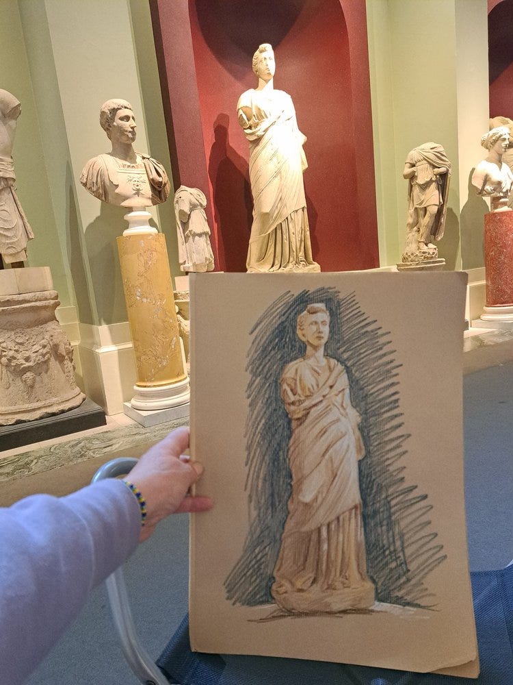 He was keen to continue with his hard pencil and little pad from the previous day. He is far more restrained than me, more orderly, enjoys textures, and is very sensitive to subjects’ expressions and mood. Tom was engrossed for a good hour doing the beautiful pencil sketch (below) of a head and torso medley. I chose Hadrian’s drowned lover Antinous, with the improbable shoulders. The statues are lit in various ways, which create interesting drawing challenges - fluctuating shadows, and combinations of warm and cool light.