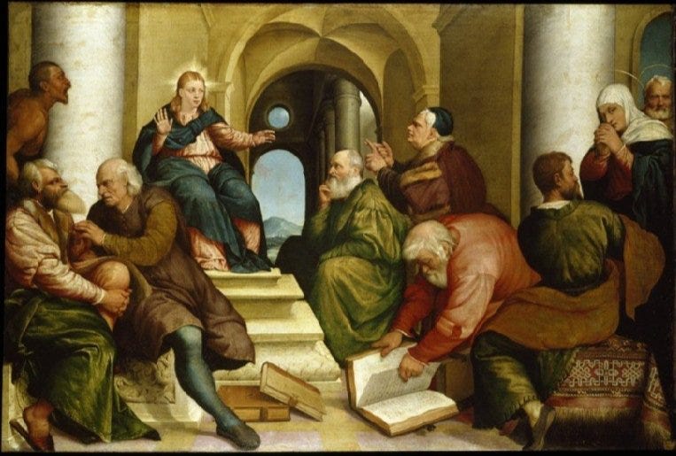 Jacopo da Ponte (”Bassano”) (c. 1510 - 1592). He noted the rendering of the book, the distant landscape, the way Christ’s halo offsets his face as a visual device, and the characterful faces in general.