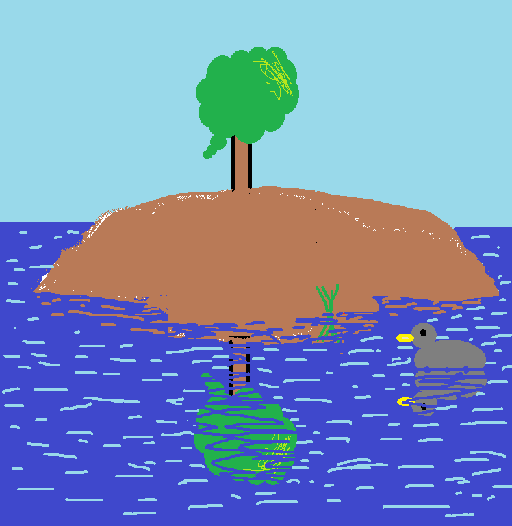 3. Using observation of the scene, adjust the interference on the reflection. You need to break it up to show the body of water, but also the reflected image. It will depend on the light how much the reflection colours vary from the real objects. it will depend on the wind etc how bumpy the water surface is, and how much disruption there is on the surface. Nb there is little/no sky colour on the surface of the water where the tree and duck reflections sit. This is because the tree obscures the sky behind it. But the darker blue ‘body’ colour of the water still plays across the tree’s reflection.