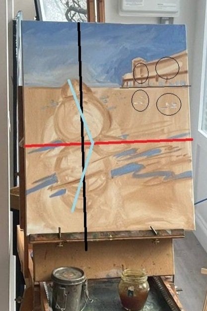 Nb when working from life, the location of the red line depends on your eye level, and the distance between you and the objects. But if you just mentally extend the surface of the water under your subject, it’s intuitively easy to locate once you understand the concept.