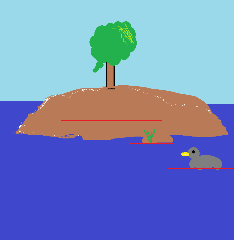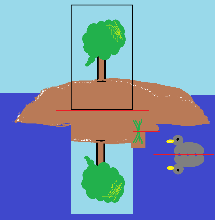 1. Draw an imaginary horizontal line, where it would be if it was a red stick floating on the water surface directly under the subject. This line is different for different subjects in the picture. It’s easy to imagine when the subject touches the water, like the duck and the reeds. But for subjects above the level of the water (like the tree), you need to imagine the plane of the water surface extends under your subject.