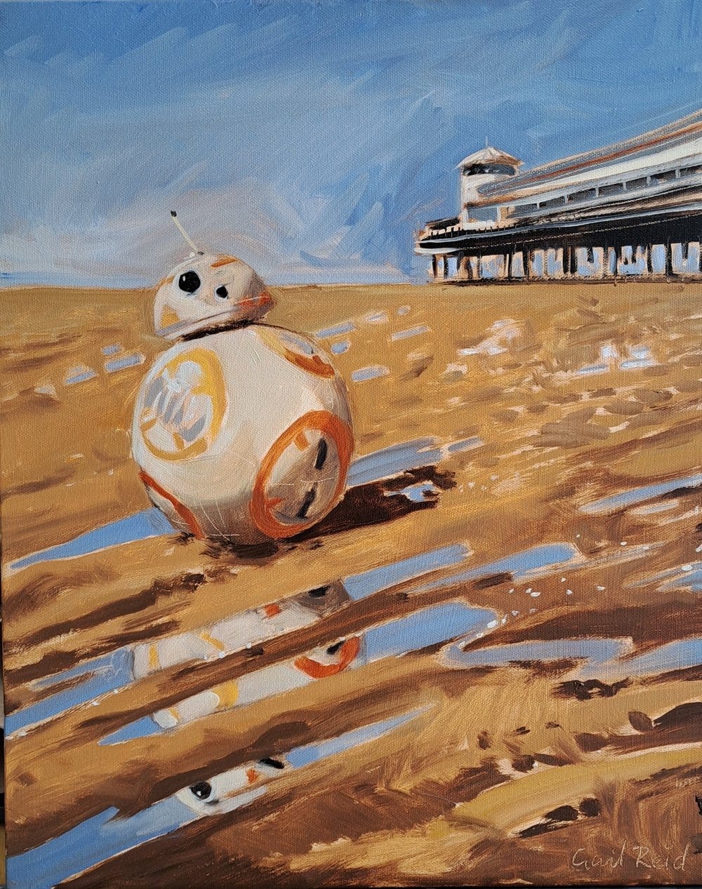 Once I'd laid in sand and sky, I used a long thin 'rigger' brush to sweep the thin white lines of the pier, BB8's antenna, spot the highlight on the eye (instant character, as per Soggy Rabbit, if you know you know!) and a few sparkles on the sand.