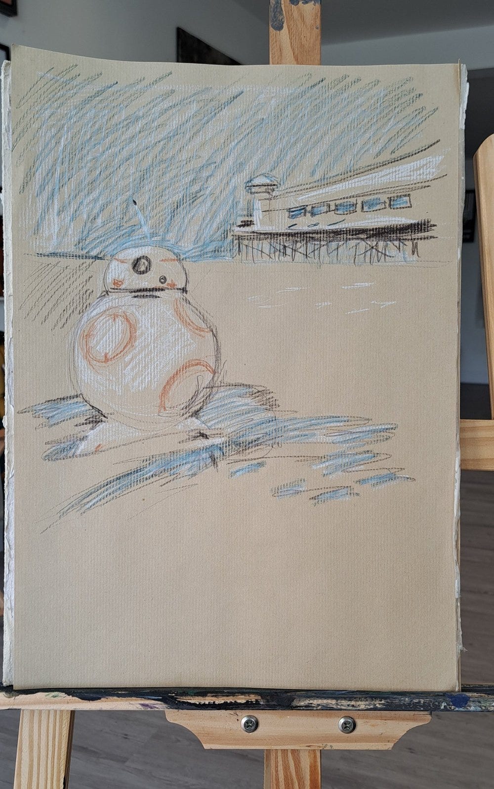 Start with a composition sketch - even a tiny monochrome thumbnail helps, particularly when reflections are a feature that you want to make room for. This sketch was an investment of a few minutes, allowing me to consciously design the composition. It saves time if you start painting knowing the size and position of key elements, in this case the Grand Pier in Weston super Mare, BB8 (Star Wars character), and the puddles on the sand. The reflection was intended as a feature, so you can see I left plenty area below BB8 in anticipation. This kraft paper and sketching technique are SO useful for getting information down quickly. see my boost your sketching blog for more info and links to materials.