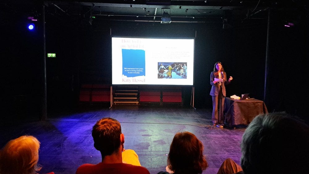 Once I’d adjusted to the surreal experience of listening to Katy in person (after blasting The Great Women Artists podcast on my studio speakers for so long), I really enjoyed tonight’s event at The Tobacco Factory. Her familiar energetic delivery was undinted by having been in Edinburgh and Amsterdam already this week. She deftly whistled through snippets from the book, sharing quotes and images from artists she’s interviewed/studied, anecdotes, and answering some great questions.