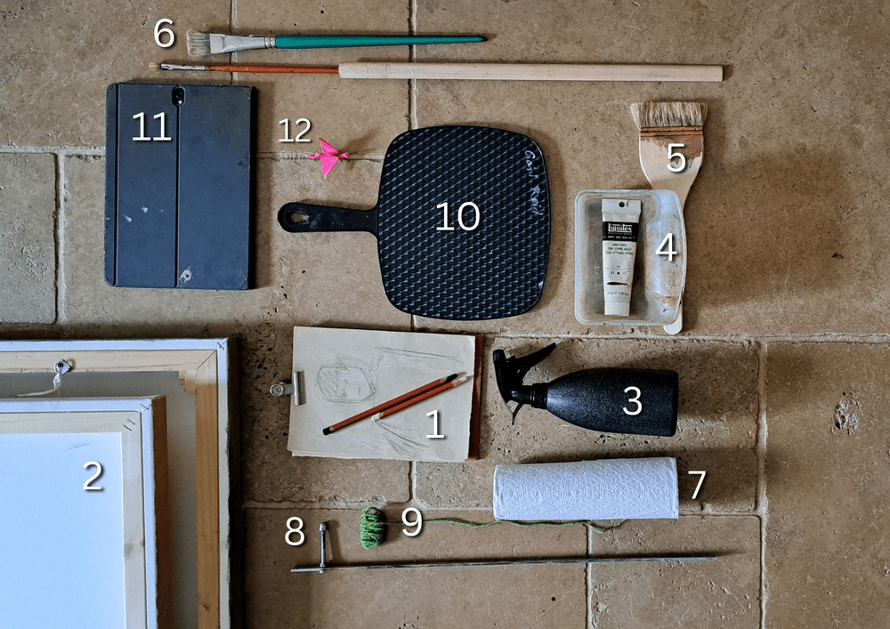 Mirror (big, lightweight, with a handle - to see the painting and sitter in reverse, which helps me check for errors in my likeness)