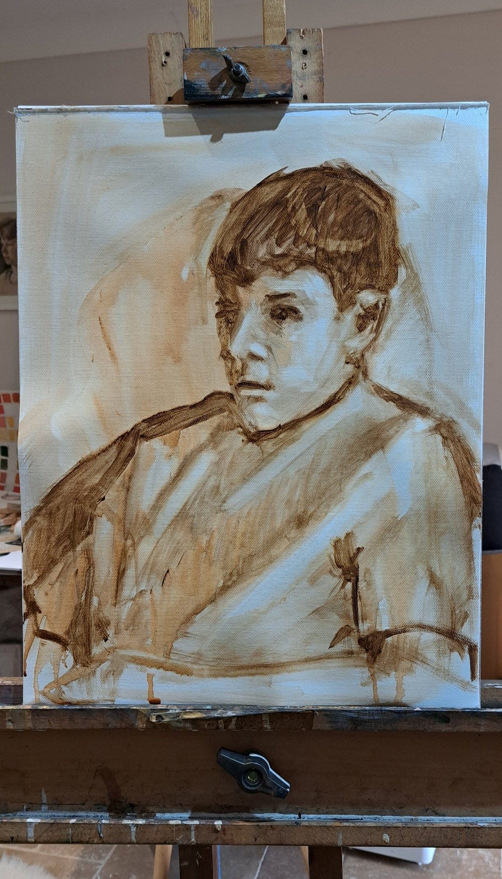 The aim is to decide composition and get a solid underpainting in Burnt Umber acrylic paint. This dries so quickly that once the sitter has had their break at the end of the first hour it will be ready to paint over in oils. Any part of the canvas that I don’t manage/want to paint in oils, will at least be the right value (light/darkness).