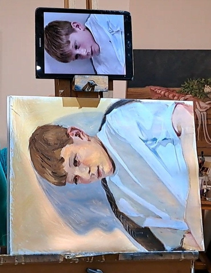 My aim is to simply progress the picture. At this point, I sometimes use the reference photo to paint from. It can be helpful for fine details, to check relative values (light/darkness of areas). I don’t tend to use it for the big shapes, unless the likeness/proportions are really off. Although photography distorts shape and colour, occasionally it’s helpful when looking for a bit of ‘pop’. So it’s mainly insurance in case the sitter is very mobile, or the painting’s going wrong, or both.