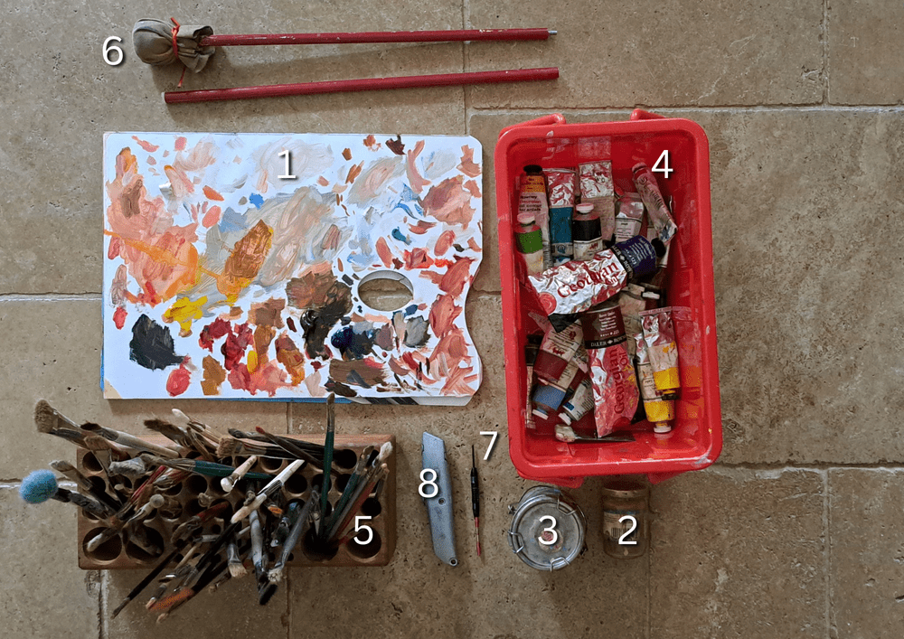 A maulstick (or “mahl stick”) that can be screwed together for extra length. Great when working into wet paint in the centre of a large canvas, to avoid smudging what’s already there. Many people use them for steadying too, but I tend to take my chances with an imprecise brushstroke! I love seeing different artists’ variations on the maulstick on the show.
