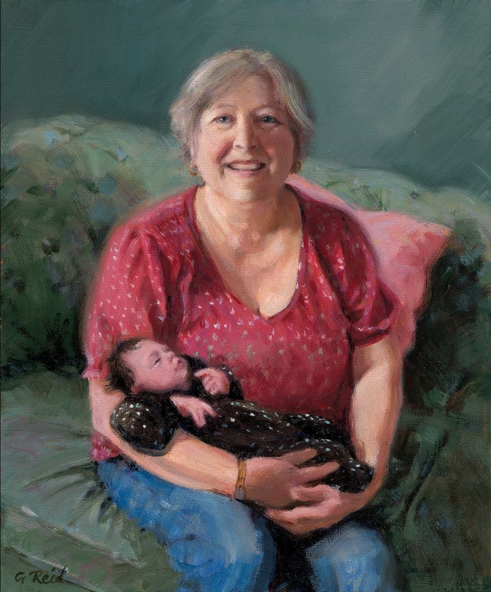 This much loved lady, Judi, had the pleasure of knowing her latest grandchild was on the way, but sadly she died before baby Roberta was born 💔. For this commission, I was able to pick from a wide range of family photos, to find something that would work as a composite of her pose, hairstyle, the newborn baby, the babygrow, and the background. The light and angles are never exactly consistent when combining photos, so a little artistic licence helps create a naturalistic effect. Throughout the process I checked in with the family about decisions, likeness, etc. It was such a joy to receive this feedback, shared with kind permission: "Hi Gail...Tears all round ... couldn’t stop looking at it... Thank you so much for giving us this special moment. You really did grasp exactly what we wanted, and made her real again for us. It’s such a beautiful picture. I will send you another pic of it in situ once they decide where to hang it... thank you thank you". This is 10x12" oil on canvas. I usually work a bit larger, often from life, but in this case the size was ideal, and the challenge was engrossing. Using Niche Frames' scanning service, the family have been able to order additional copies, with a choice of sizes and frames.