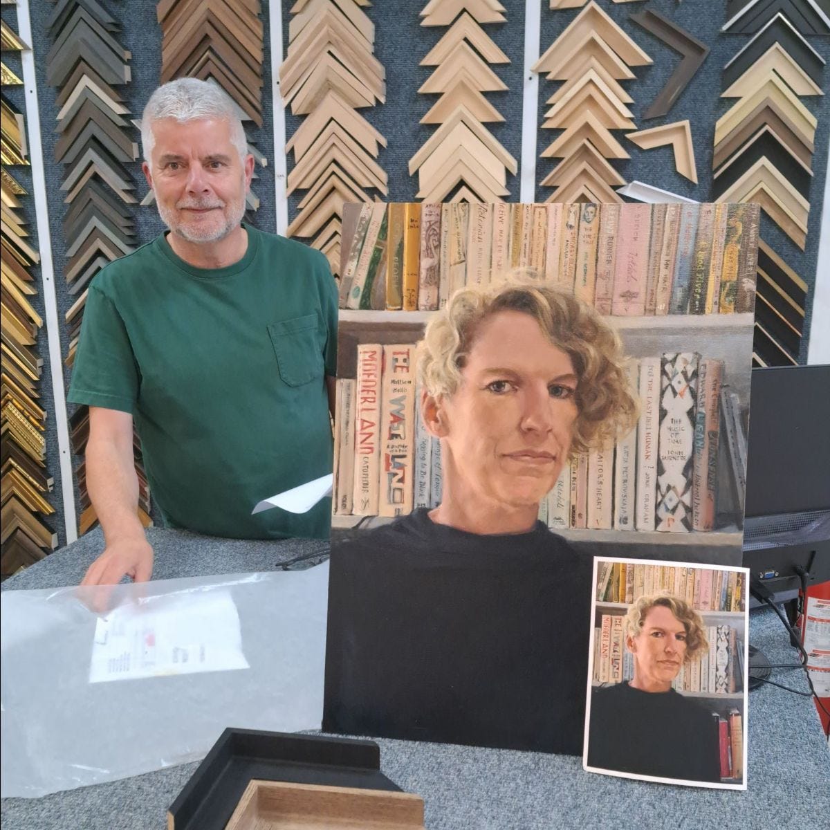 The wonderful Niche frames (local to me) facilitate a service that I offer my commission clients: to have the finished original painting or drawing professionally scanned, so it can be reproduced at any size, now or in future, on paper or canvas. Simon (photographed here) is helping me colour-match the proof of Cato Pedder's portrait against the original painting. I was delighted with how well it has come out, and will be back soon to have the original framed!