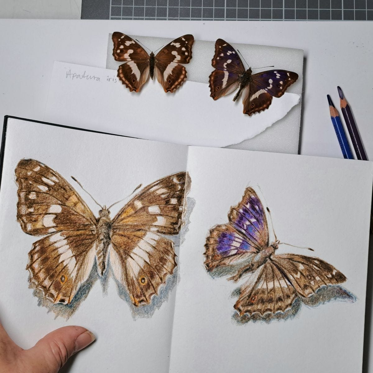 I've started a concertina sketchbook of creatures that frequent dung, in preparation for a larger piece amplifying this vital ecosystem. First up are purple emperor butterflies. Rhian Rowson (the natural history curator at Bristol Museum and Art Gallery) has been incredibly helpful setting me up with specimens from the large collection there. Although I've drawn a female and a male, only the males feed on dung and have the purple colour. The purple is 'structural colour' rather than pigmentation, visible when wings are viewed from a certain angle.