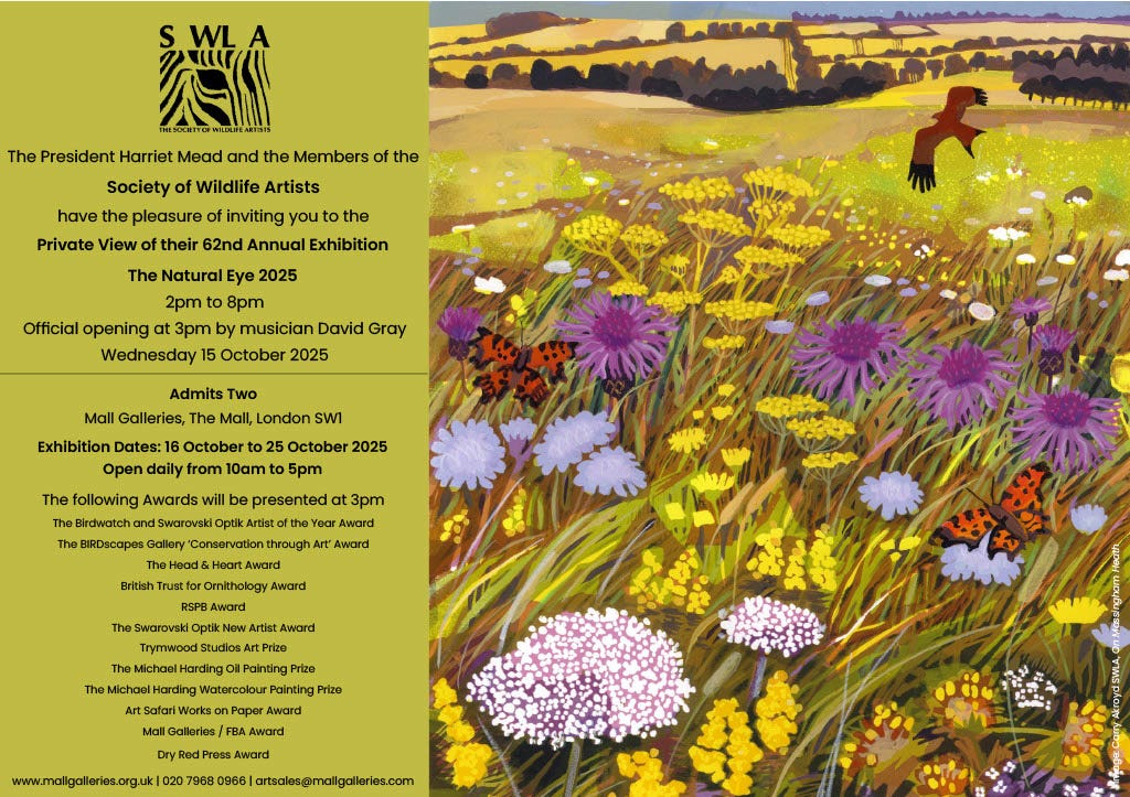 The Society of Wildlife Artists’ annual exhibition ‘The Natural Eye’ opens to the public on 16th October. As an exhibitor, I am delighted to invite you to the Private View on the afternoon of 15th October. Set between Buckingham Palace and Trafalgar Square, this is a fun, friendly event, buzzing with contemporary wildlife artists and collectors. The musician David Gray will open the show at 3pm. Feel free to save or print the image below as your ticket. If you click it, you will link to the full exhibition information.