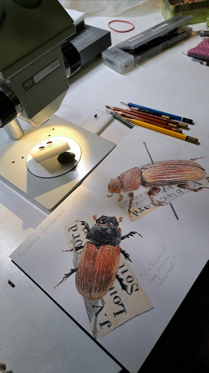 As well as a deep dive into the world of museum-curated insect specimens, the work has been reminiscent of my days of project management: Trying to define the deliverables, and to get buy-in from interested parties has been intense! My sketchbook is filling up, and the concept is starting to gain traction with potential exhibition opportunities. With enthusiastic support and help from the entomologists in Bristol, and the Natural History, museums. They seem really keen to share the importance of keystone species like dung beetles, and the environmental conditions needed for those species to thrive.